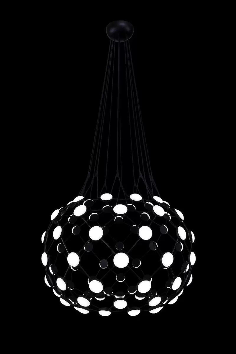 This is a Modern Molecular LED Chandelier. It features a geometric black metal orb structure holding numerous small, white LED lights, creating a striking Sputnik-style cluster. Suspended by multiple cables, its bold design is perfect for a luxurious, contemporary.