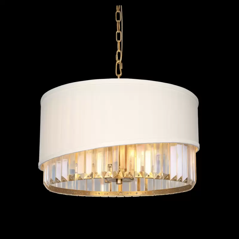 This Zopyros chandelier blends modern elegance with subtle glamour. It features a cylindrical white fabric drum shade that softly diffuses light, creating a warm, inviting ambiance. Beneath the shade, a row of crystal prisms adds a touch of sparkling sophistication, reflecting light beautifully and enhancing the fixture’s luxurious appeal. Suspended by a classic brass chain, this chandelier is perfect for dining rooms, entryways, or living spaces—capturing the essence of Zopyros: Creating Timeless Elegance.