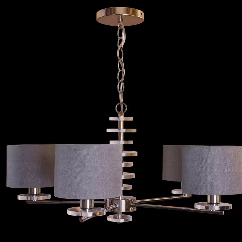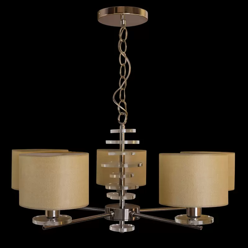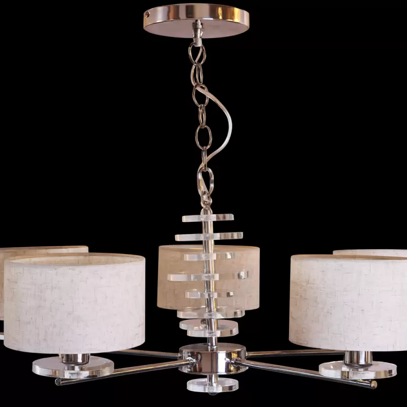 Exuding modern luxury, this chandelier features a striking blend of chrome-finished metal and crystal accents, delivering a polished yet refined aesthetic. Five cylindrical beige fabric shades provide a warm, ambient glow while adding texture and softness to the overall design. The central stacked crystal column catches and reflects light, creating a subtle sparkle that elevates the fixture’s sophistication.
