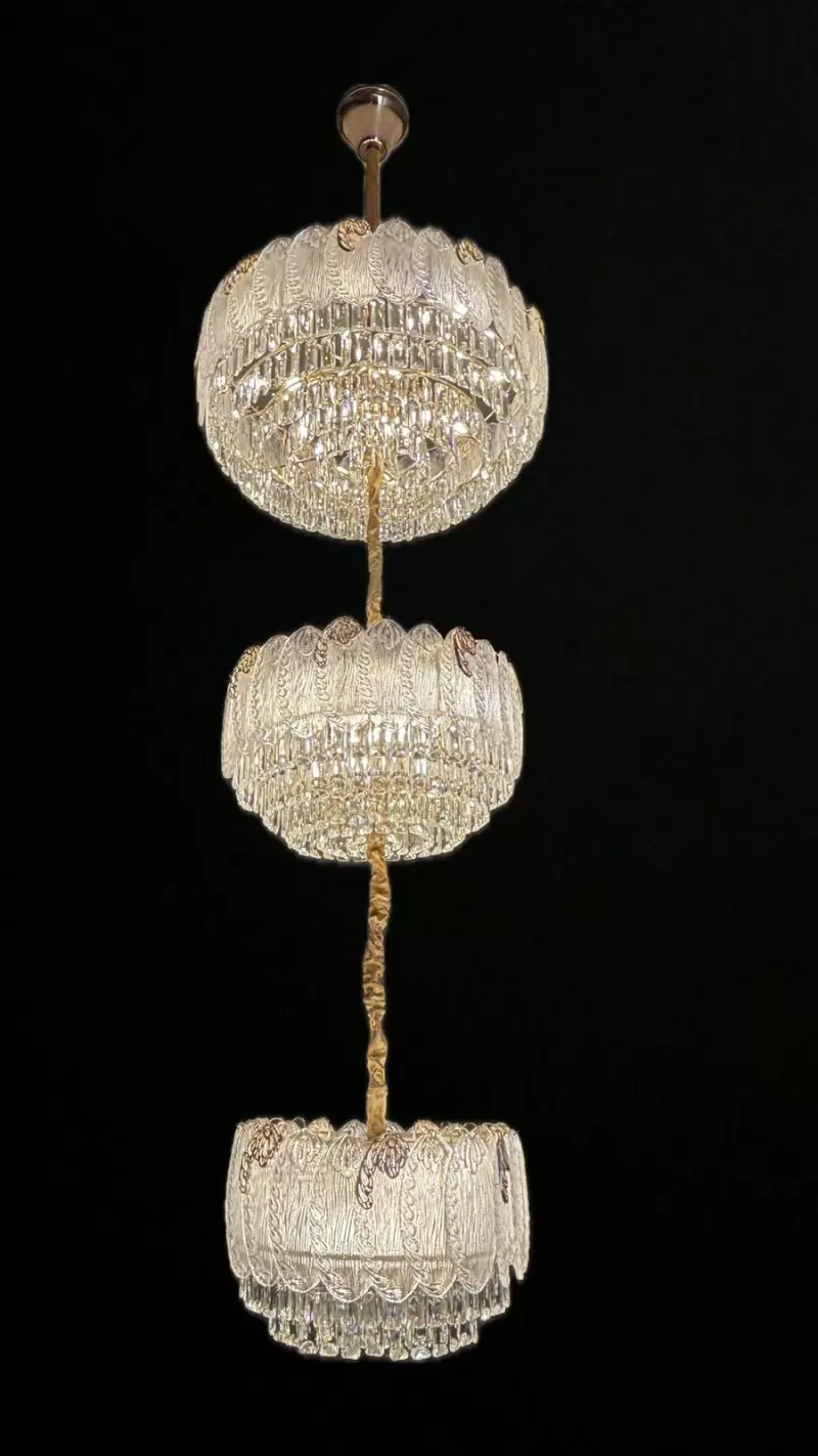 Perfect for double-height ceilings, staircases, or grand living areas, this chandelier transforms any space into a statement of elegance and opulence. The gold detailing adds a regal charm, while the cascading design enhances depth and visual drama.
