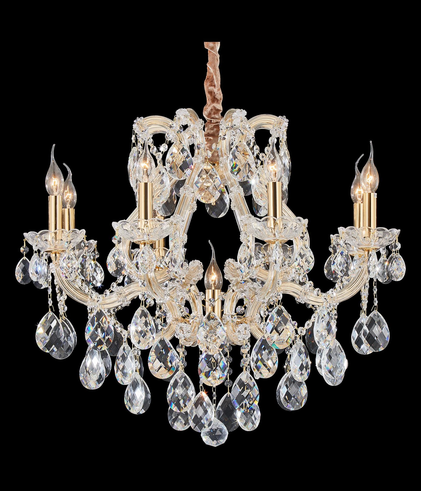 This chandelier is a luxurious and ornate lighting fixture with a classic, opulent design. It features eight arms, each holding a candle-style light with flame-shaped bulbs. The arms and central frame are richly adorned with clear, faceted crystal drops that shimmer and reflect light beautifully. The metal framework has a golden champagne finish, adding warmth and elegance. Perfect for grand interiors like ballrooms, dining halls, or upscale living rooms, this chandelier adds a regal and sophisticated ambiance to any space.