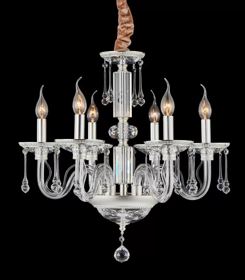 It features eight candle-style lights with flame-shaped bulbs, arranged symmetrically around a polished central column. The structure is crafted from clear glass and chrome-finished elements, giving it a refined, minimalist glow. Delicate crystal drops hang from each arm and along the central body, adding subtle sparkle and elegance. The clean lines and transparency offer a light, airy feel while maintaining luxurious appeal. Perfect for contemporary dining rooms, foyers, or lounges, it elevates interiors with its graceful presence. This chandelier is a true expression of Zopyros’ style — refined, radiant, and timelessly elegant.