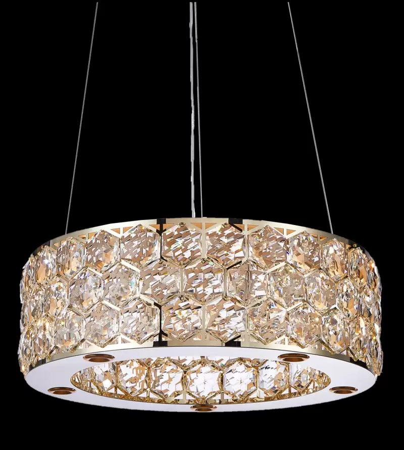 This modern ZOPYROS pendant light features a circular, drum-shaped design suspended by sleek wires. Its body is adorned with faceted crystal elements encased in a golden frame, creating a luxurious, shimmering effect. The combination of warm metallic tones and intricate crystal detailing gives it a contemporary yet opulent appeal—ideal for dining areas, living rooms, or upscale commercial spaces seeking a bold, stylish statement.