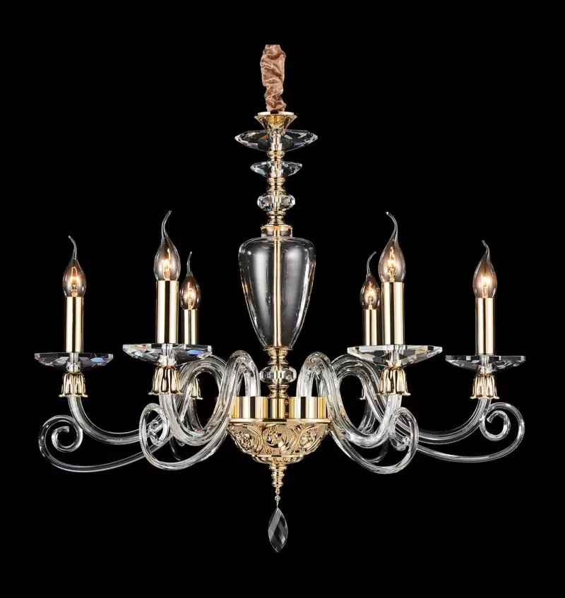 This luxurious chandelier showcases timeless elegance and intricate craftsmanship. Featuring six gracefully curved arms made of crystal-clear glass, it holds candle-style bulbs on polished gold bases, each with a flame-shaped design for a classic look. The central column combines gold detailing and faceted glass elements, culminating in an ornate finial at the top. A finely carved gold centerpiece anchors the piece, enhanced by a crystal pendant drop for added sophistication. Ideal for grand interiors, this chandelier exudes refinement and opulence, making it a stunning focal point in dining rooms, foyers, or upscale living spaces.