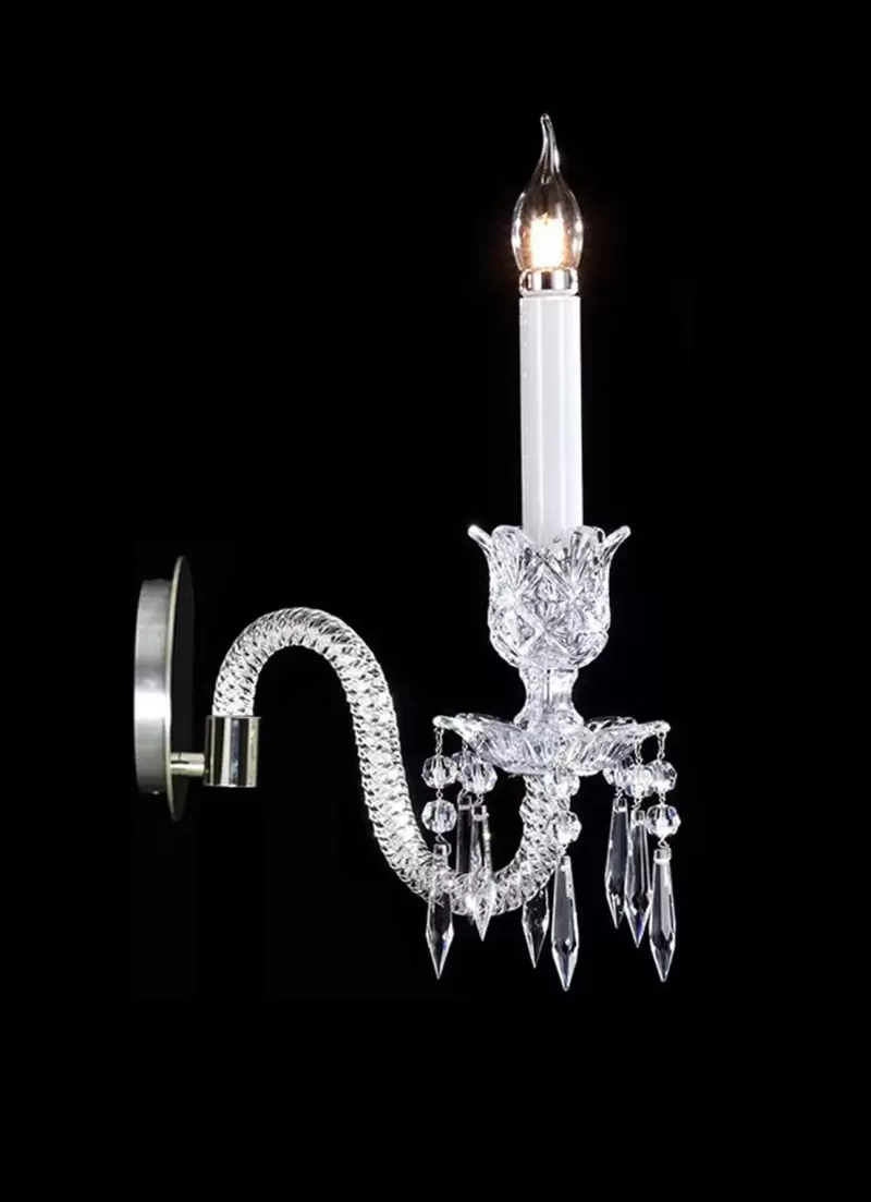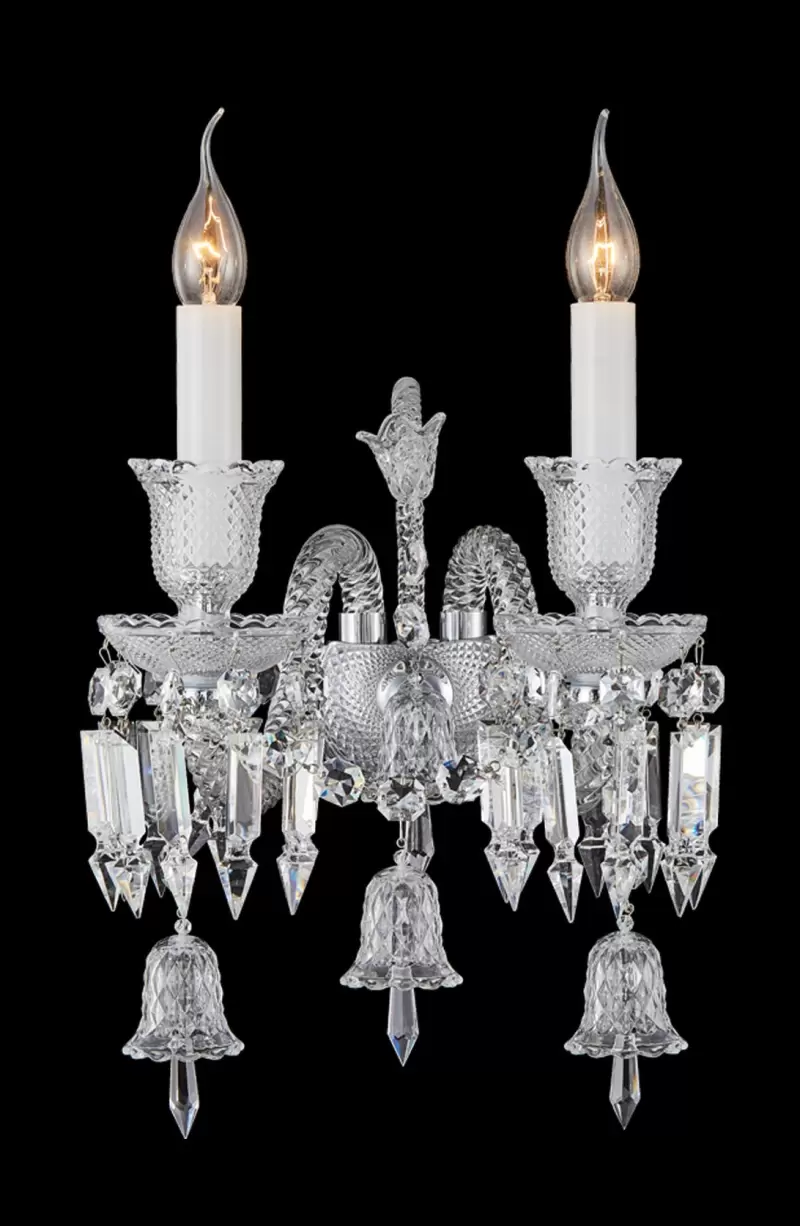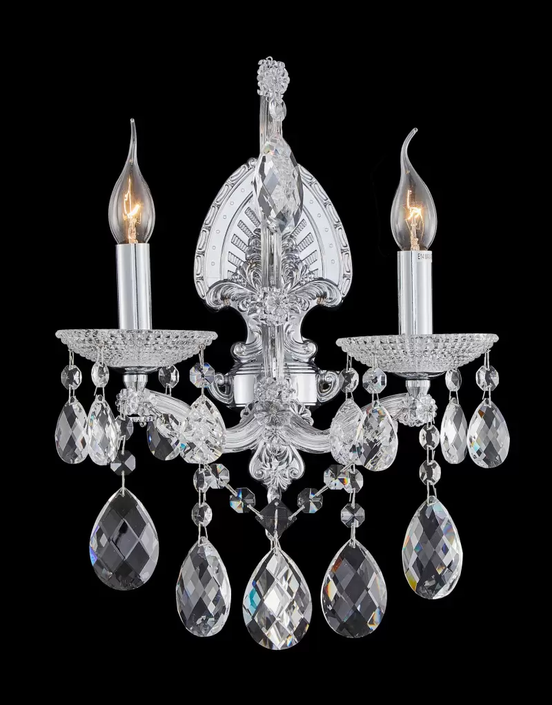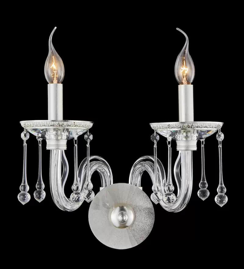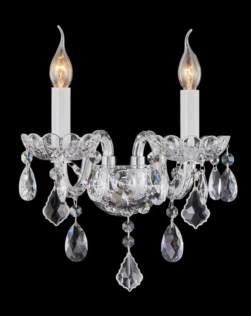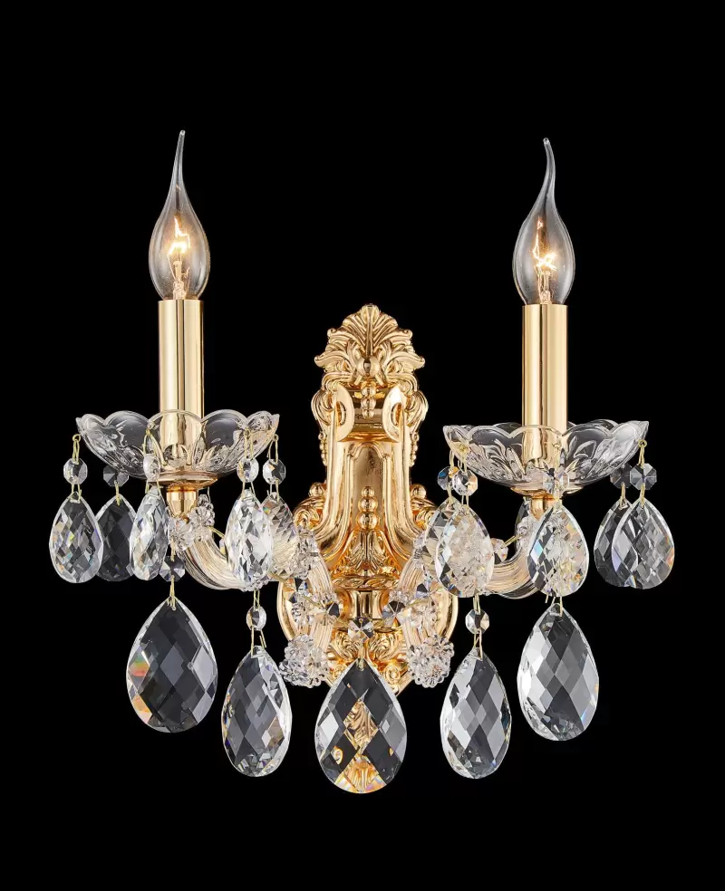 This image shows a beautifully crafted ZOPYROS wall sconce featuring two candle-style lights with flame-shaped bulbs. The fixture is adorned with sparkling crystal drops and elegant detailing, creating a luxurious, classic look. The combination of polished metal and intricately cut crystals adds a touch of sophistication, making it ideal for hallways, bedrooms, or accent walls in refined interiors.