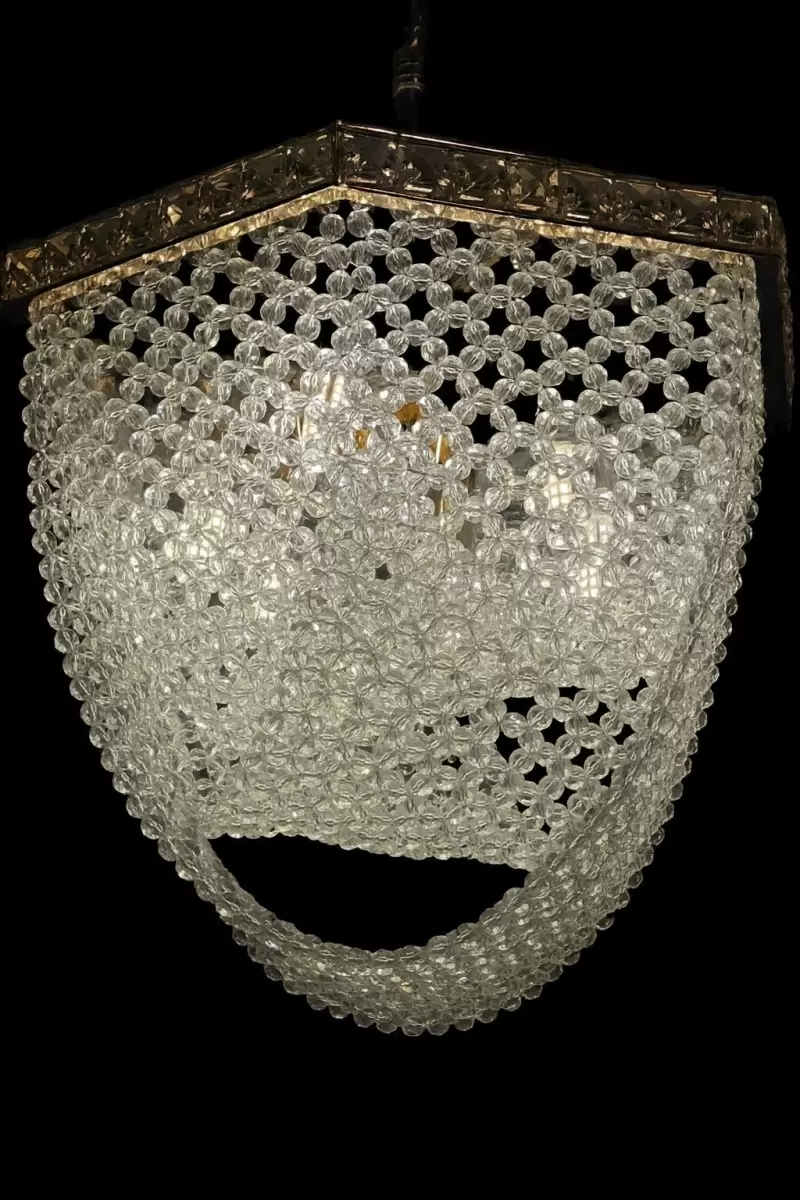 The chandelier features a cascade of shimmering crystal beads arranged in a graceful, basket-like form. Suspended from a sparkling crystal-covered chain, the fixture diffuses light beautifully, creating a radiant, sparkling effect that fills the room with glamour and sophistication. The soft curves and meticulously crafted crystal details make this piece a dazzling centerpiece for any upscale interior.