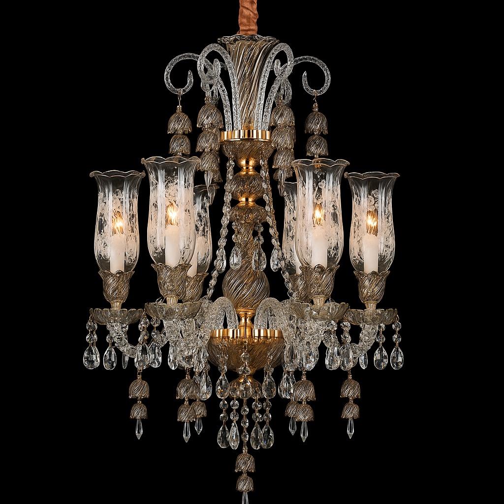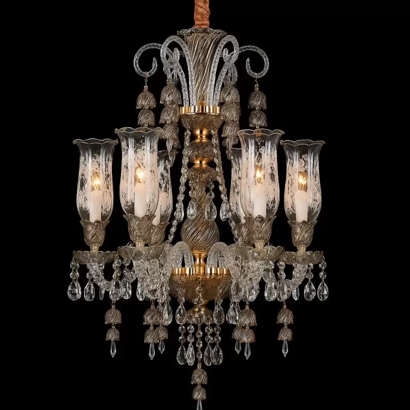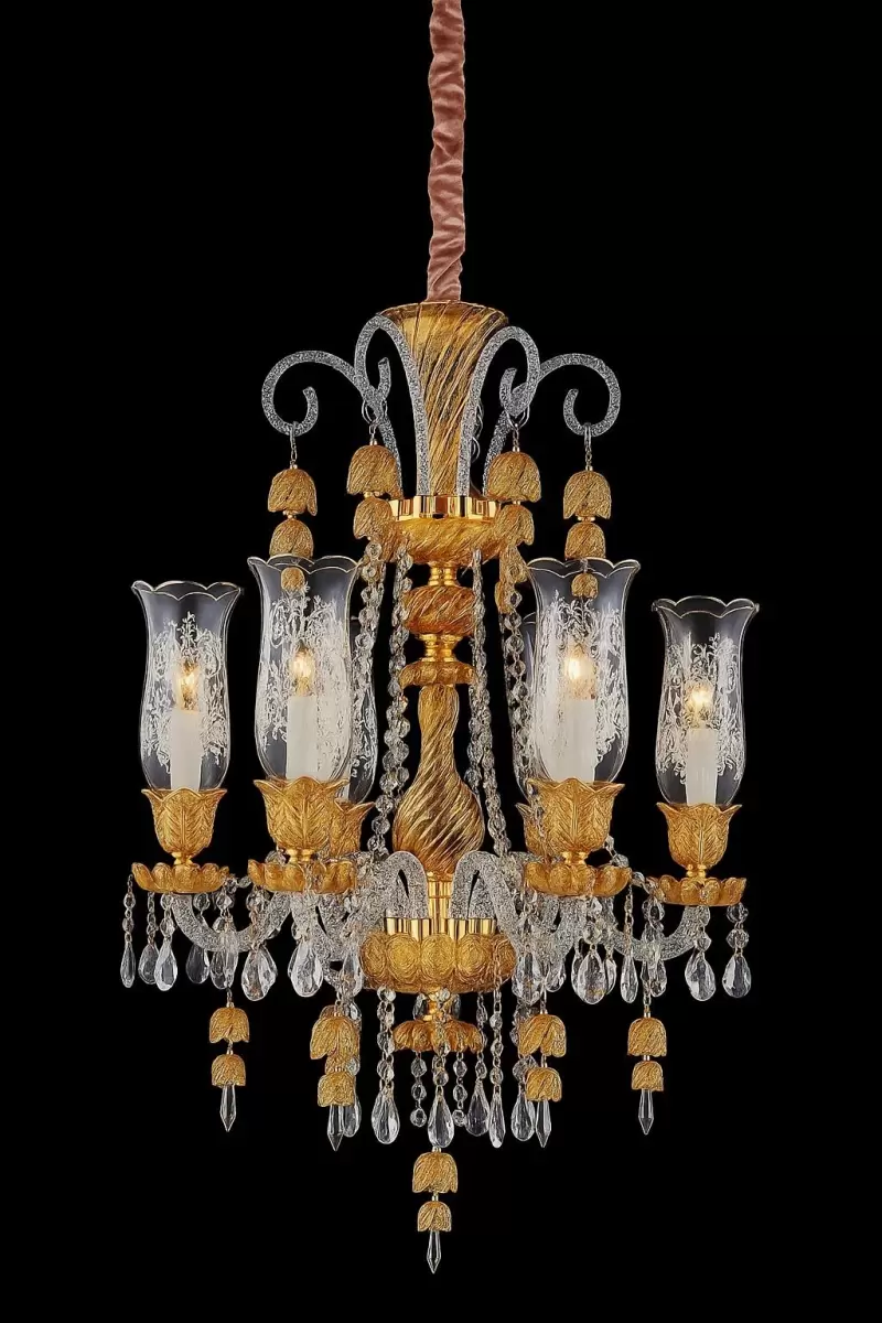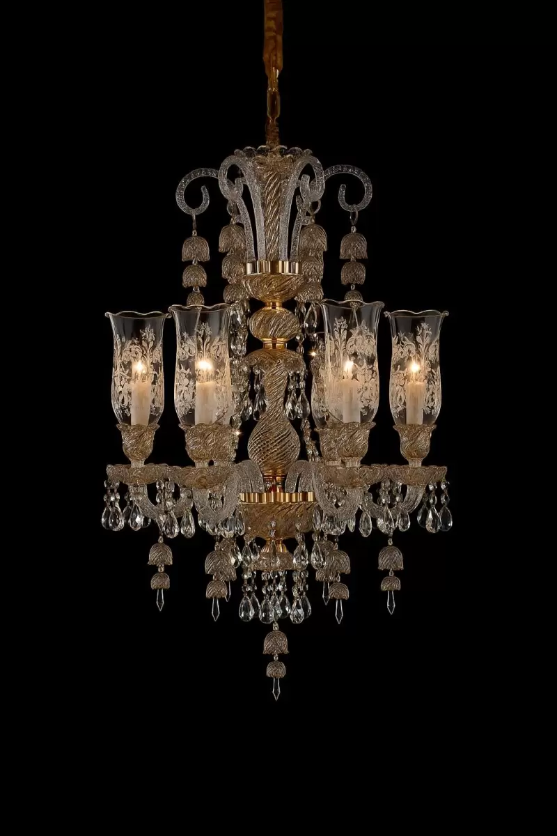 This exquisite ZOPYROS chandelier showcases a vintage-inspired design with intricate craftsmanship. It features multiple upward-facing glass shades etched with delicate floral patterns, each encasing a warm light. The central column is richly detailed with golden accents and adorned with cascading crystal droplets and ornate glass elements. Perfect for traditional or classical interiors, this chandelier brings timeless elegance and a warm, inviting glow to any space.